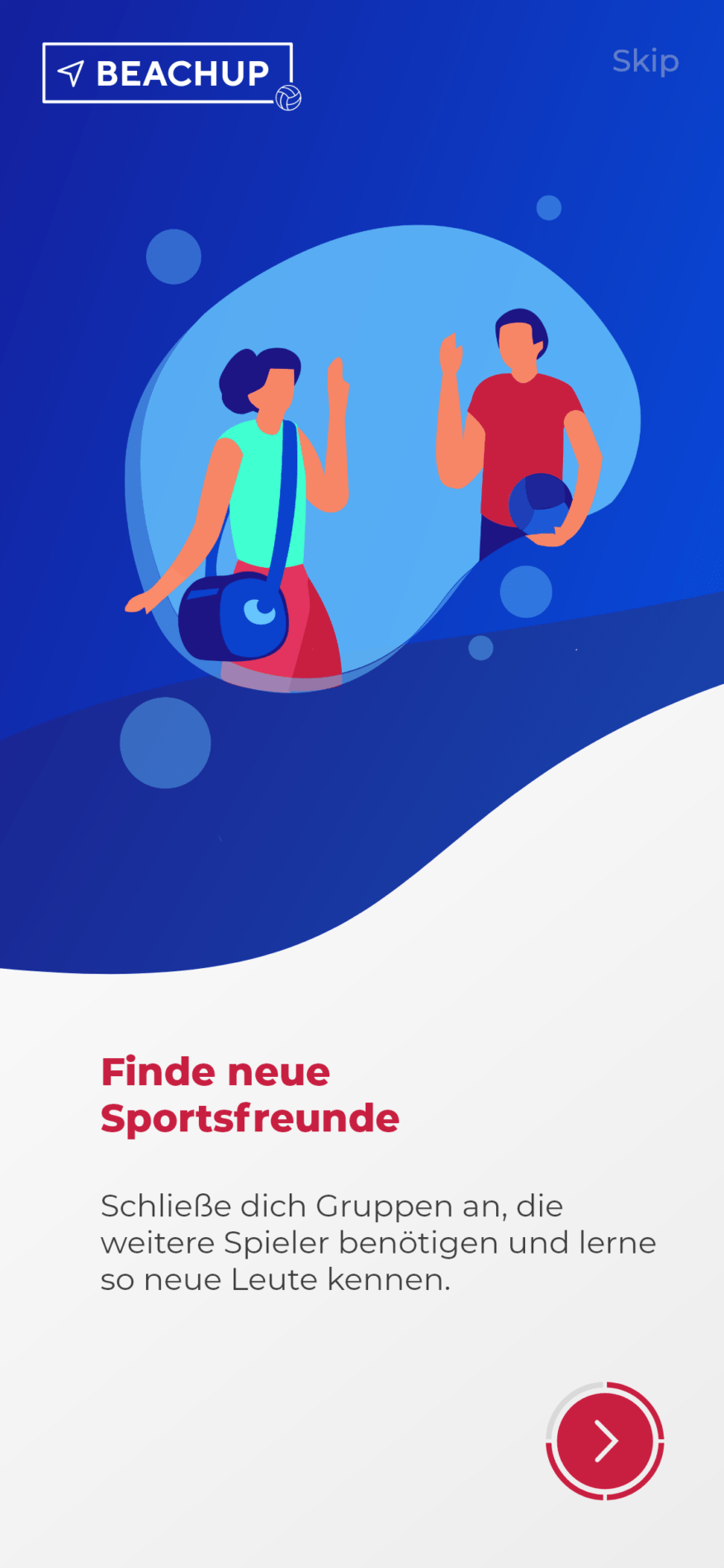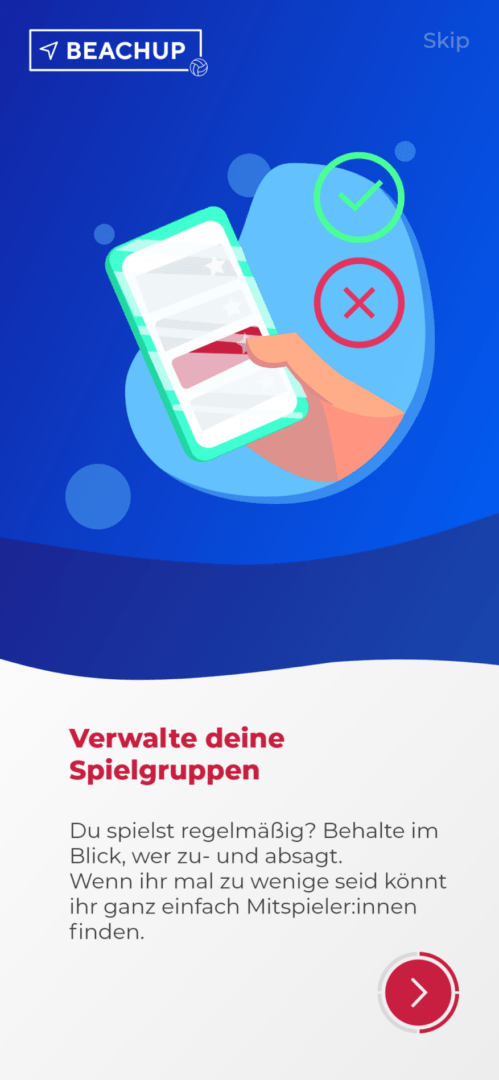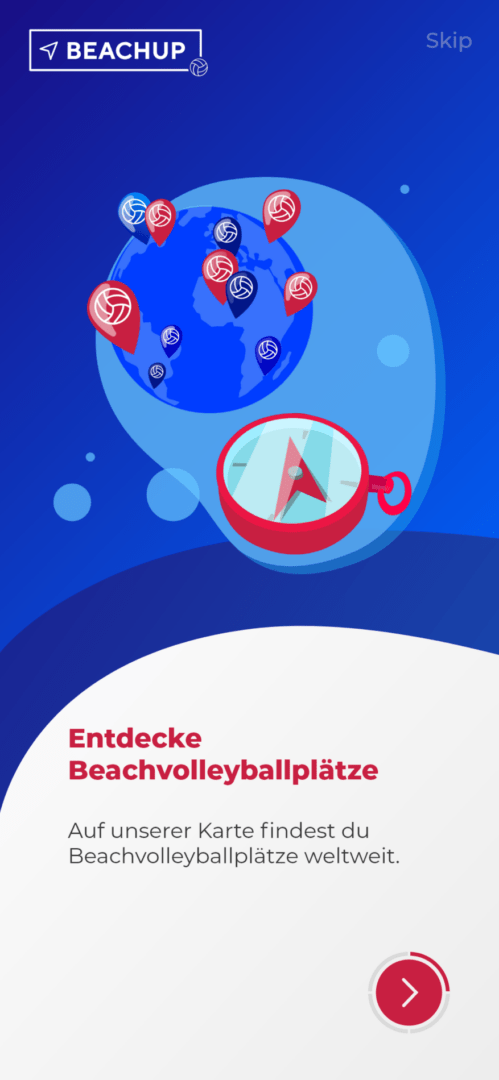 Alle einzelnen Elemente wurden in ein einheitliches und harmonisches Layout überführt. Der Text ist in eine prägnante Headline gegliedert, die die wichtigsten Funktionen beschreibt und gleichzeitig eine Handlungsaufforderung darstellt. Im letzten Panel wurde ein Button eingefügt, über den man sofort Teil der Community werden kann. Wer das Onboarding überspringen möchte, kann jederzeit im Onboarding über den Button „Skip“ abbrechen und direkt zur App springen.
