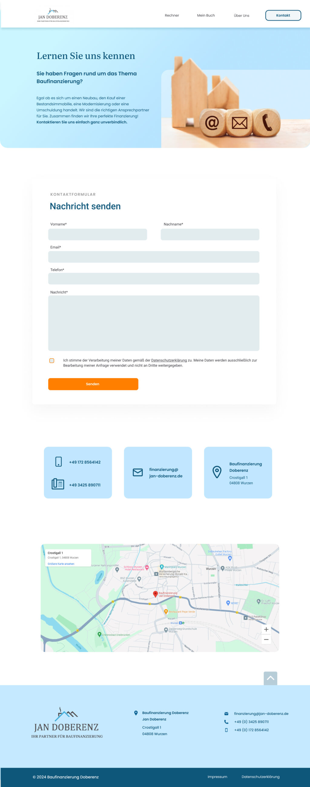 Auch auf den weiteren Seiten der Website von Baufinanzierung Doberenz wurde das Design konsequent umgesetzt, um ein durchgängiges Nutzererlebnis zu schaffen. Jede Seite folgt dem Corporate Design und greift dabei auf das von mir entwickelte Style Tile zurück, das die Farbpalette, Typografie und Gestaltungselemente des Unternehmens integriert. So entsteht ein harmonisches Gesamtbild, das die Kernbotschaft stärkt und die Wiedererkennbarkeit des Unternehmens nachhaltig unterstützt.
