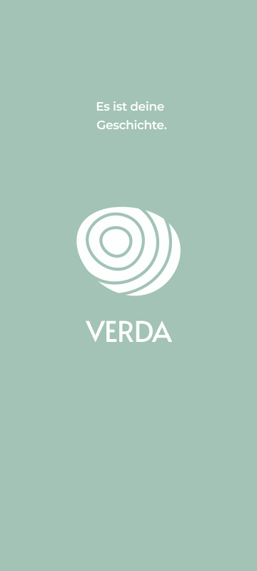 Das konzentrische Muster der Jahresringe wird auf einen Meilenstein projiziert und von diesem subtrahiert. Die Bildmarke wird natürlich, aber auch klar, beruhigend und gleichzeitig spannungsvoll durch die angedeutete Räumlichkeit der Kreise. Das Symbol erinnert auch an einen Fingerabdruck. Dies ist passend, da es sich um seine persönliche Geschichte handelt, die mit VERDA aufgezeichnet wird.